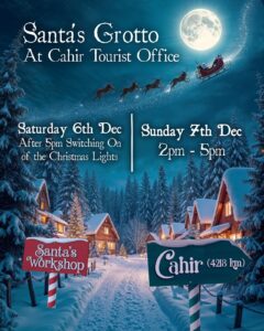 Santa’s Grotto is coming to Cahir! The Cahir Tourist Office will be transformed into a magical festive space as Santa makes a special visit this December!